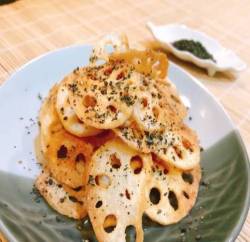 Bạn đợi cho phần củ sen chiên/nướng nguội bớt rồi chia làm 2 phần, cho vào 2 bát. Một bát trộn cùng bột phô mai, một bát trộn cùng rong biển đã bóp vụn. Vậy là có thể thưởng thức được rồi!