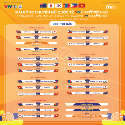 Giải bóng chuyền nữ Quốc tế VTV Cup Ferroli 2023 sẽ diễn ra tại Nhà thi đấu Lào Cai, từ ngày 19/8 – 26/8/2023. Kính mời quý vị, quý khách hàng theo dõi trực tiếp tất cả các trận đấu trên VTV2, VTV5, ứng dụng VTVGo và kênh Youtube VTV Thể Thao!